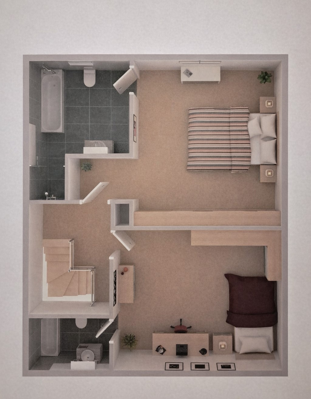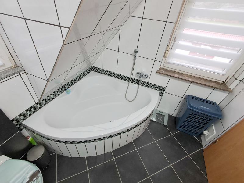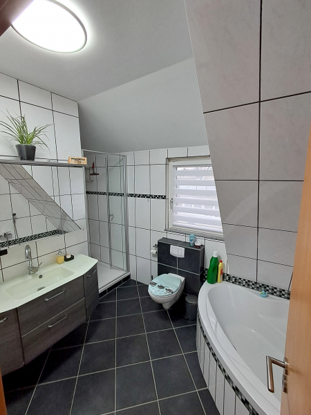 Im Obergeschoss befinden sich das Elternschlafzimmer sowie ein Kinderzimmer, die beide über ein eigenes Badezimmer mit Toilette verfügen. Diese seltene Raumaufteilung bietet ein hohes Maß an Privatsphäre und Komfort – ideal für Familien, Gäste oder heranwachsende Kinder, die ihren eigenen Rückzugsbereich schätzen.