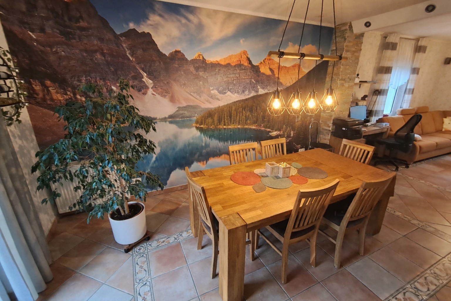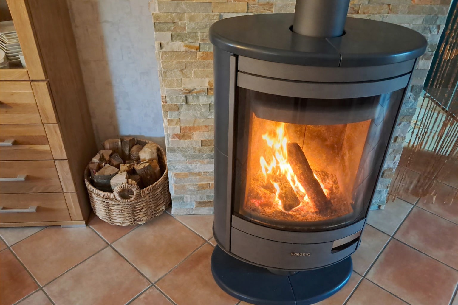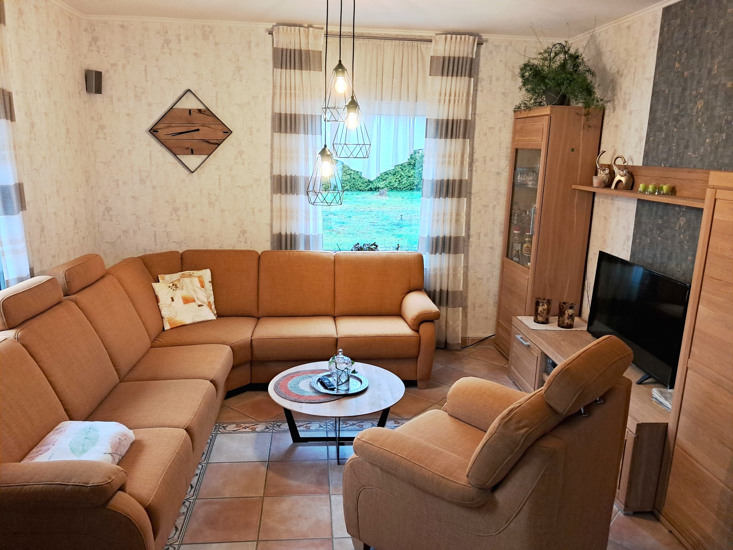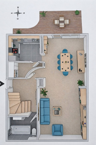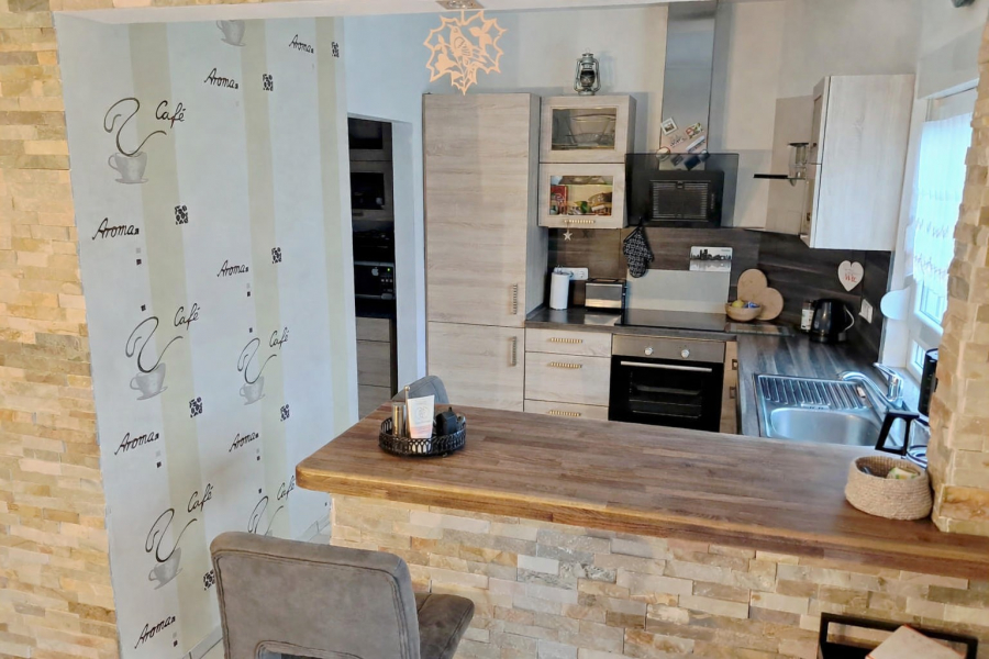 Im Erdgeschoss erwartet Sie eine große Wohnküche mit Tresen – ein echter Hingucker. Das angrenzende Wohnzimmer überzeugt durch seine helle Atmosphäre, einen gemütlichen Holzofen sowie eine angenehme Fußbodenheizung, die für ein besonders behagliches Wohngefühl sorgt. Von hier aus gelangen Sie direkt auf die nach Westen ausgerichtete Terrasse, auf der Sie sonnige Nachmittage und entspannte Feierabende genießen können. Ein praktischer Vorratsraum sowie eine Gästetoilette runden das Erdgeschoss sinnvoll ab.