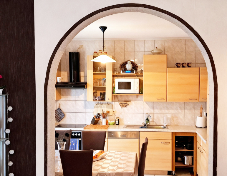 Rundbogen-Eingang, die Platz für Kochkunst und gesellige Runden